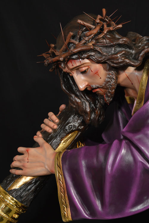 En las imágenes en serie también está destacando, como diría mi amigo Alfonso Piñero, haciendo que las más planas y casi aniñadas imágenes de este tipo adquieran una categoría, que gracias a las repolicromías de Montes Carpio tomaban un cariz mayor, incluso que las encarnaciones y estofados primitivos, como ha pasado en la imagen del Nazareno bailenense, consiguiendo darle una categoría que no sacaban de los talleres, normalmente de Olot. El jueves entre la masa que se acercó a obsérvalo, la verdad es que disfruté oyendo los elogios y como los muchos detalles que ahora atesora la imagen llegaban a los ojos de los más sencillos y menos doctos del pueblo, los cuales unánimemente están valorando la intervención como un total acierto. Ahora el rostro del Nazareno es más vivo, más real, más dolorido y dulce, y a su vez más devoto, insuflándole más unción divina. Los recursos polícromos han conseguido crear venas donde nunca las hubo, matices que han humanizado mucho más los grafismos más planos de este tipo de imaginería como labios, cejas, parpados, etc… incluso el terreno de la peana ha elevado la calidad polícroma que no atesoraba. Dos puntos novedosos a destacar, uno es el nuevo tono de la túnica que viste el encorvado nazareno, pasando del anterior burdeos o granate al morado tan típico de las túnicas de sus nazarenos. La policromía en este punto es igualmente magnifica, con sus claros oscuros, aunque yo creo que se debería haber seguido la tradición artística e iconográfica en que los nazarenos con ropajes no reales se policromaban en un burdeos –rojo por la Pasión y la sangre derramada por Cristo- tal como estaba antes, aunque lo suyo hubiese sido mucho más apagado como el que tuvo originalmente, aunque bueno si eso es lo que ha querido la hermandad, tampoco está mal. En este detalle, Montes Carpio ha respetado las cenefas que insufló Tirao Carpio en magas, cuello y bajos de la túnica, aunque lo ideal hubiese sido intentar recuperar a base de un estafado en oro las primitivas cenefas aunque con la sencillez que ha quedado también está más que digno y bello. El otro detalle que he visto acertadísimo es el enriquecimiento de la corona de espinas, la cual como apunta el mismo imaginero se la incluido más tallos y espinas que ha conseguido crear una sencilla y bella corona de espinas del tipo serpenteante, la cual destaca más los volúmenes y los tormentos de la pasión, lo que ha conseguido unido a la magnífica policromía darle a esta imagen un valor añadido entre la admiración que siempre ha despertado entre sus devotos y amantes de las cofradías bailenenses. Igualmente a reseñar es la inclusión tan utilizada por estos imagineros cordobeses de incluir gotas de sangre de cristal donde culminan los realistas regueros de sangre que imprimen en sus policromías tan características. También ha enriquecido la expresión del Señor la inclusión de unas leves pestañas en sus parpados. Se ha continuado la estampa de las últimas décadas de dejar la cabeza despoblada de las características tres potencias.